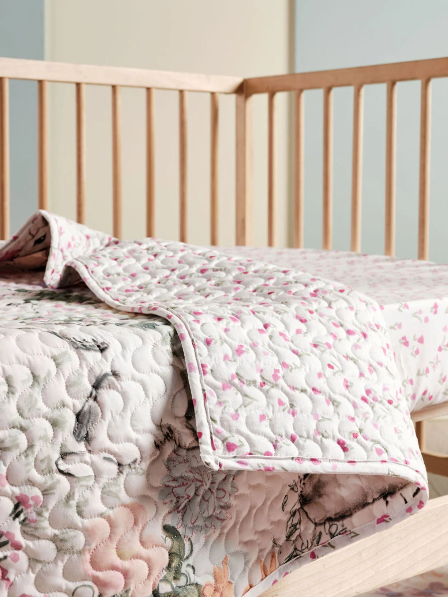 The coverlet, which has a 200 GSM polyester fill, reverses to a plainer floral print, has a bound edge and looks adorable paired with its coordinating quilt cover, fitted sheet, and play mat.