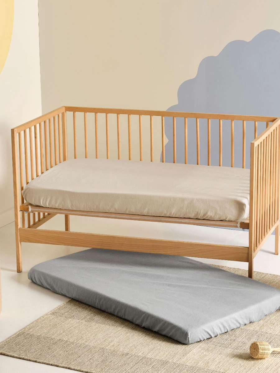 Designed for cots, this two-piece set includes one fitted sheet in slate and another in taupe – keeping you well-supplied for those little accidents.