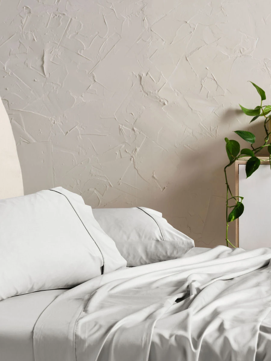 The flat sheet and pillowcases have a cuffed and piped header for a polished finish while the fitted sheet has a generous 50cm wall – perfect for all mattresses.