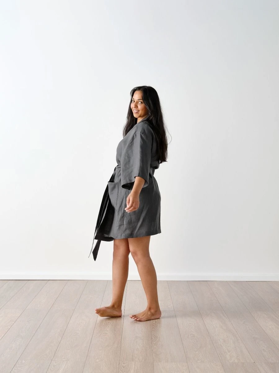 The epitome of effortless, our kimono-style Nimes short robe in magnet enjoys that lived-in style and breathable feel that can only be achieved with pure linen.