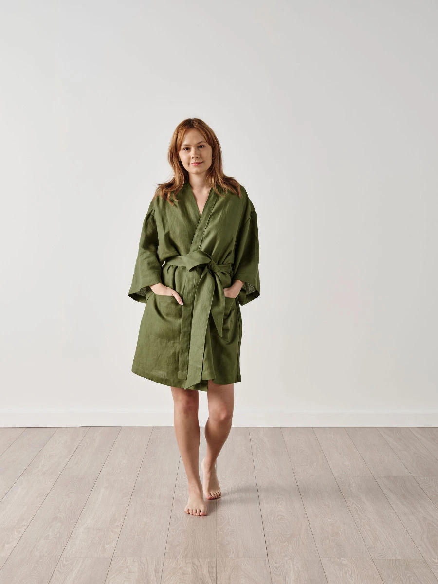 The epitome of effortless, our kimono-style Nimes short robe in moss enjoys that lived-in style and breathable feel that can only be achieved with pure linen.