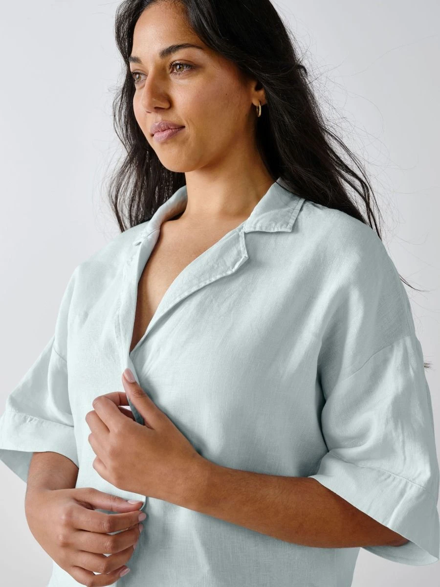 With a new, oversized fit from our previous shirt style, this short-sleeved and cropped shirt includes a collar and buttons, while the fabric will soften more so over time – perfect for everyday wear, sleepwear or an all-day lounge-around.